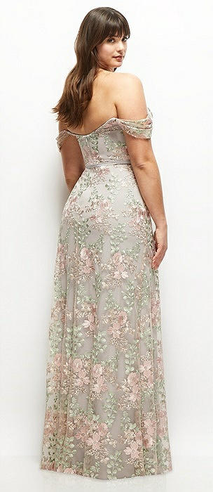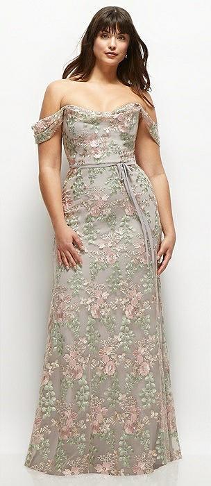 Off-the-Shoulder A-line Floral Embroidered Dress with Skinny Tie Sash in cashmere gray