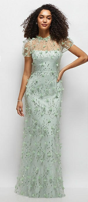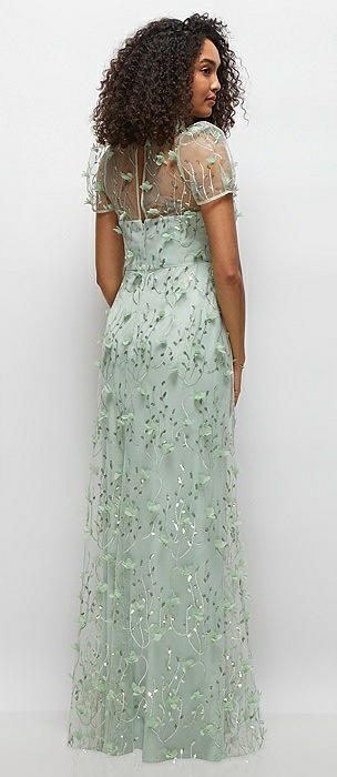 3D Floral Embroidered Puff Sleeve A-line Maxi Dress with Petal-Adorned Illusion Neckline in celadon