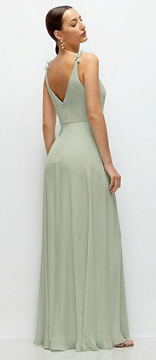 Bow-Shoulder V-Back Chiffon Gown with Front Slit in celadon