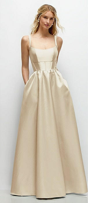 Scoop Neck Drop Basque Skirt Satin Maxi Dress with Pockets in champagne