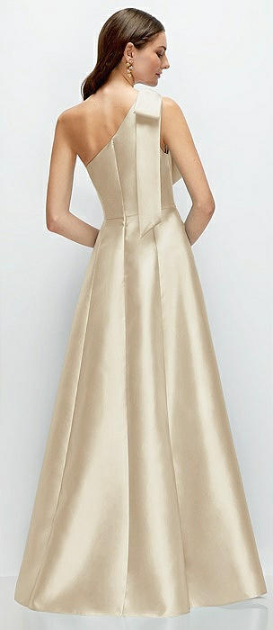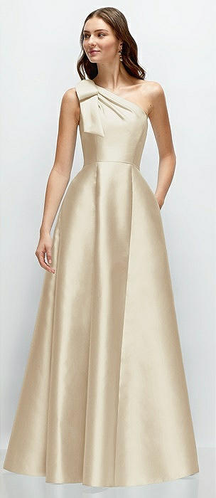 Bow One-Shoulder Full A-Line Satin Maxi Dress in champagne