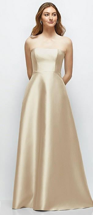 Strapless Bias Cuff Bodice Satin Gown with Pockets in champagne