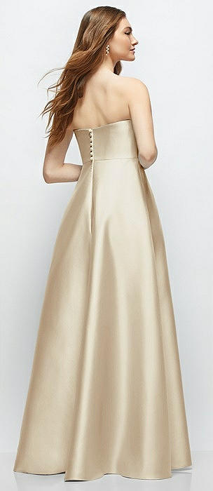 Strapless Satin Gown with Full Skirt and Covered Buttons at Back in champagne