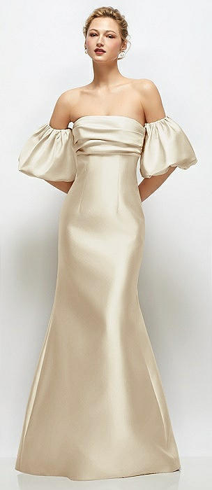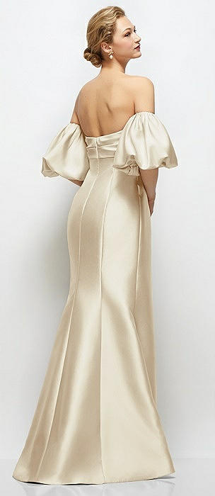 Off-the-Shoulder Puff Sleeve Satin Maxi Dress with Flared Skirt in champagne