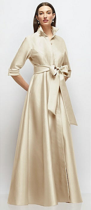 3/4 Sleeve Satin Shirt Dress Gown with Sash and Jeweled Buttons in champagne