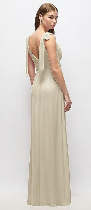 Plunge Neckline Bow Shoulder Empire Waist Chiffon Maxi Dress in champagne
