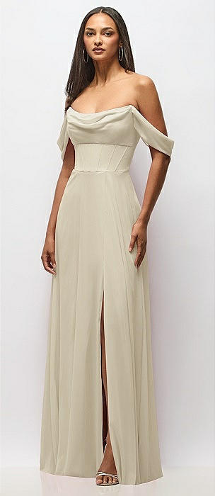 Chiffon Corset Maxi Dress with Removable Off-the-Shoulder Swags in champagne