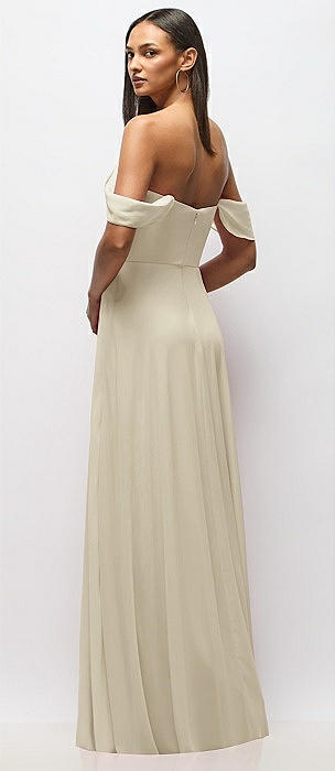 Off-the-Shoulder Draped Chiffon Maxi Dress in champagne