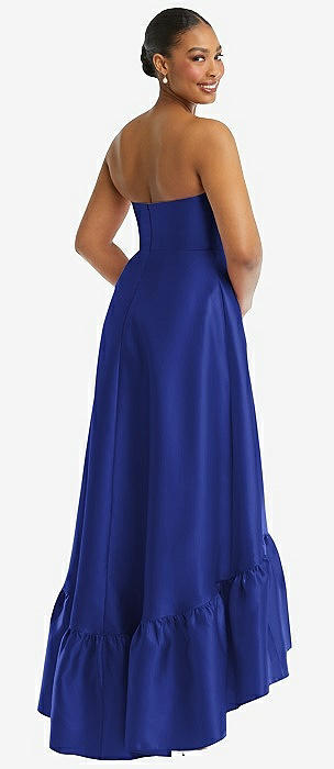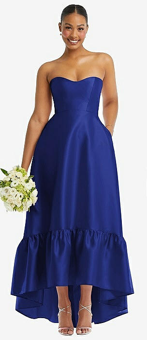 Strapless Deep Ruffle Hem Satin High Low Dress with Pockets in cobalt blue