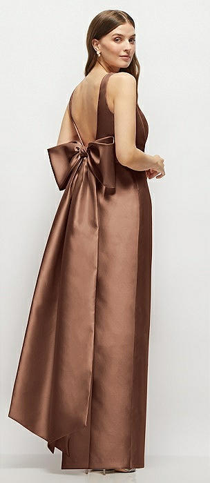 Deep V-back Satin Trumpet Dress with Cascading Bow at One Shoulder in cognac
