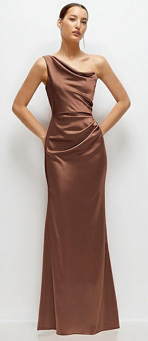 One-Shoulder Cat-Eye Neckline Fit and Flare Satin Maxi Dress in cognac