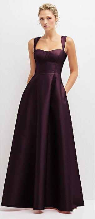Boned Corset Closed-Back Satin Gown with Full Skirt and Pockets in deep plum
