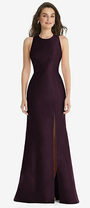 Jewel Neck Bowed Open-Back Trumpet Dress with Front Slit in deep plum