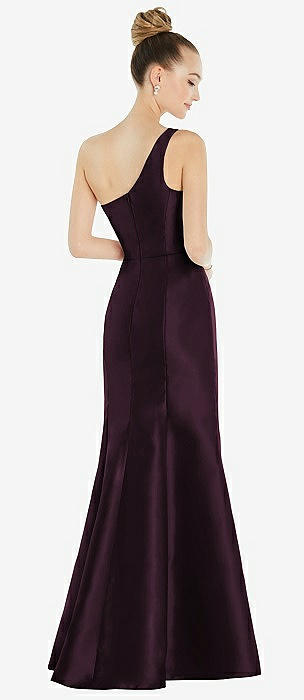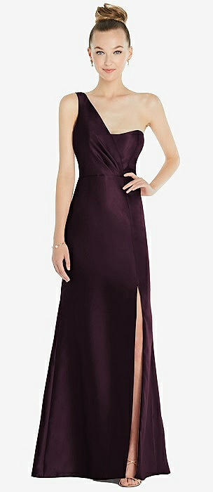 Draped One-Shoulder Satin Trumpet Gown with Front Slit in deep plum
