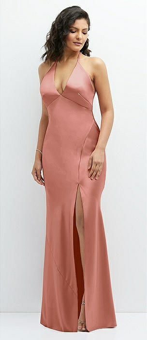 Plunge Halter Open-Back Maxi Bias Dress with Low Tie Back in desert rose
