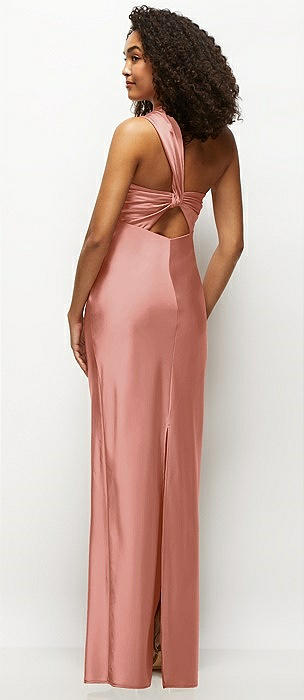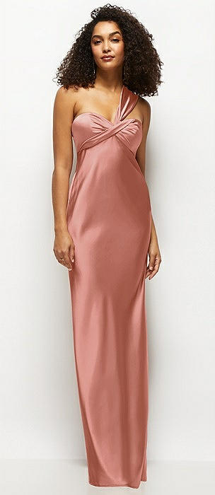 Satin Twist Bandeau One-Shoulder Bias Maxi Dress in desert rose