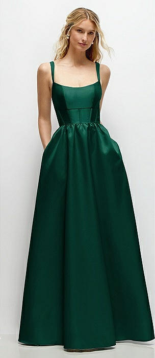 Scoop Neck Inset Corset Satin Maxi Dress with Pockets in hunter green