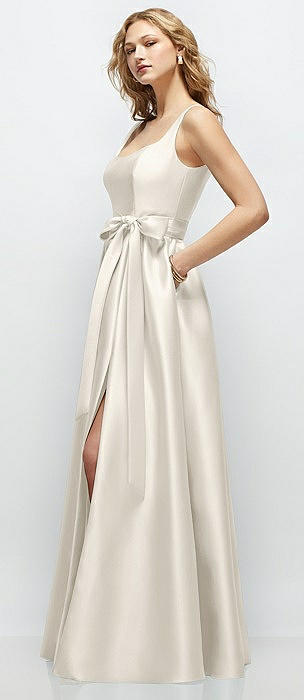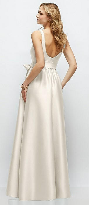 Scoop Neck Corset Satin Maxi Dress with Floor-Length Bow Tails in ivory