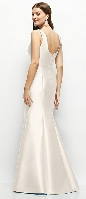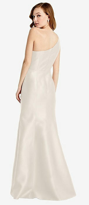 Deep V-back Satin Trumpet Dress with Cascading Bow at One Shoulder in ivory
