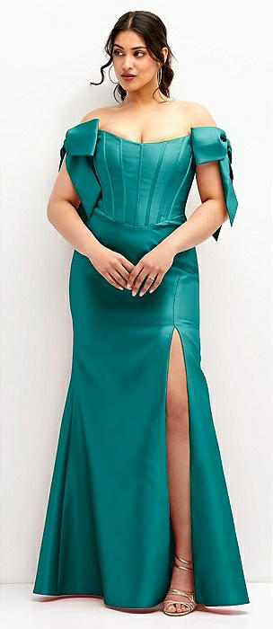 Off-the-Shoulder Bow Satin Corset Dress with Fit and Flare Skirt in jade