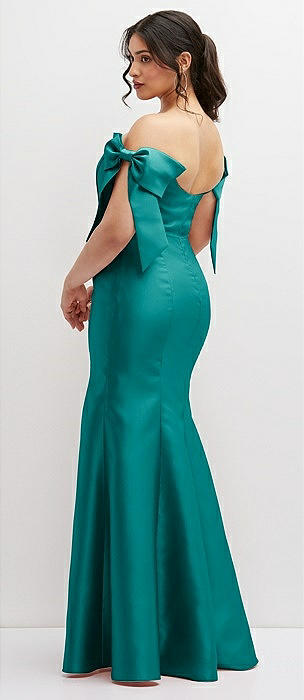 Deep V-back Satin Trumpet Dress with Cascading Bow at One Shoulder in jade
