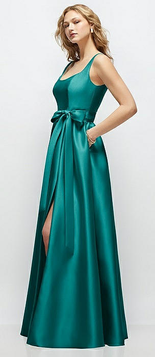 Scoop Neck Corset Satin Maxi Dress with Floor-Length Bow Tails in jade