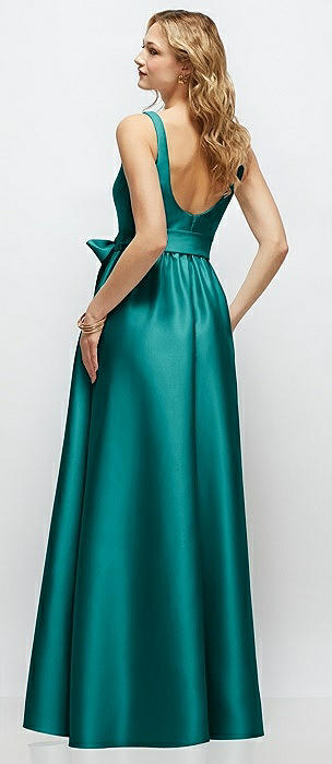 Basque-Neck Strapless Satin Gown with Mini Sash in jade