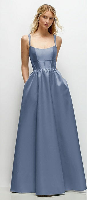 Scoop Neck Inset Corset Satin Maxi Dress with Pockets in larkspur blue
