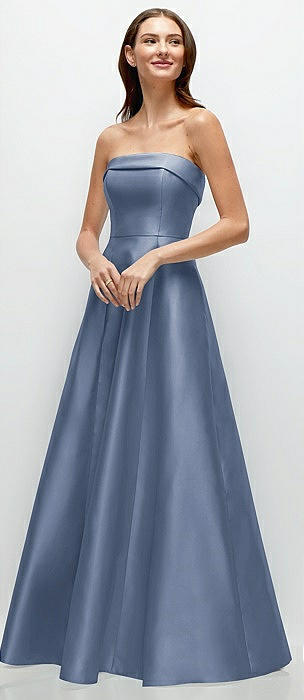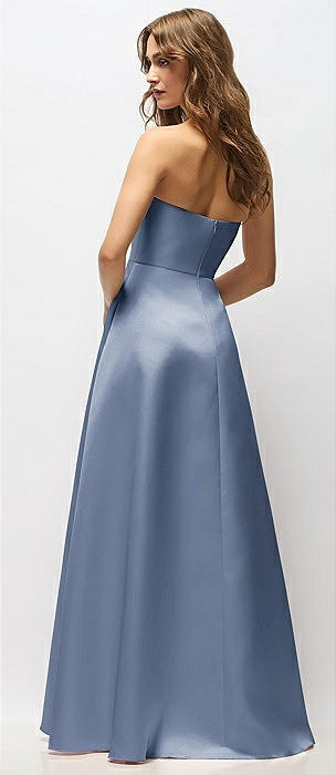 Strapless Satin Drop Waist Gown with Full Skirt in larkspur blue