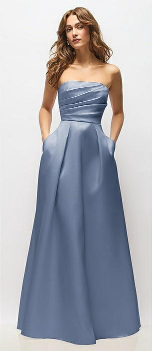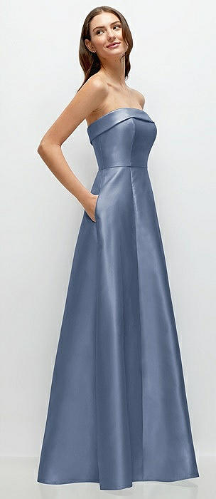 Strapless Bias Cuff Bodice Satin Gown with Pockets in larkspur blue