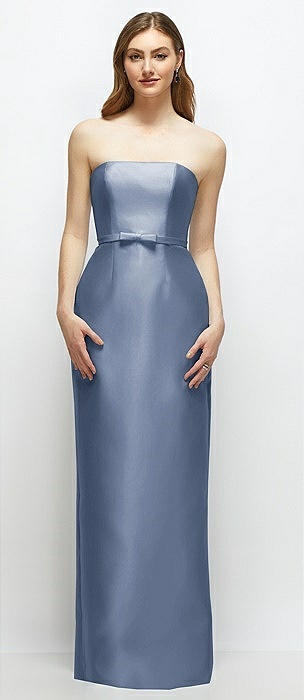 Strapless Satin Column Dress with Bow-Trimmed Skinny Belt in larkspur blue