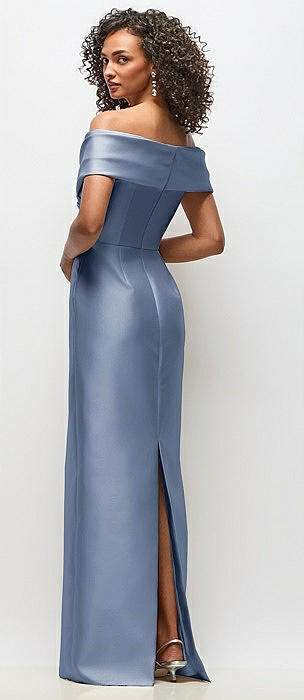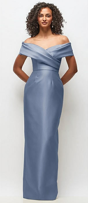 Basque-Neck Satin Column Maxi Dress with Off-the-Shoulder Bows in larkspur blue