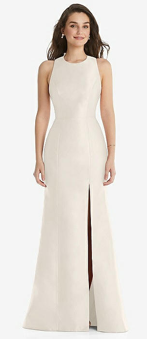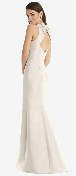 Jewel Neck Bowed Open-Back Trumpet Dress with Front Slit in ivory