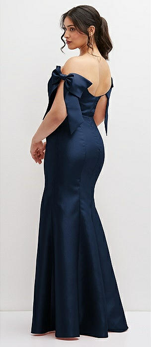 Deep V-back Satin Trumpet Dress with Cascading Bow at One Shoulder in midnight navy