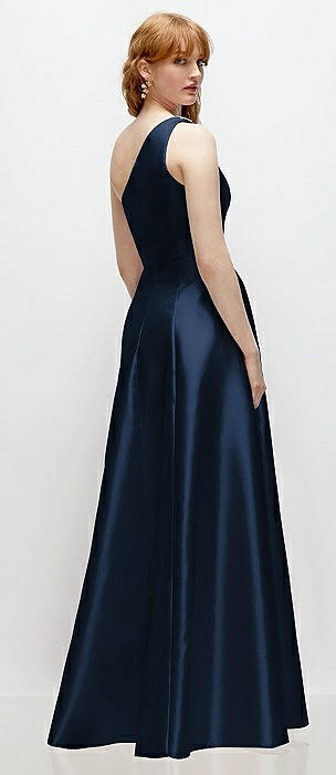 One-Shoulder Full A-Line Satin Gown with Handworked Floral Appliqué in midnight navy