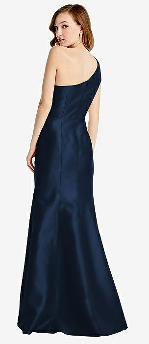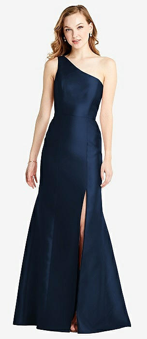 One-Shoulder Crepe Trumpet Gown with Front Slit in midnight navy
