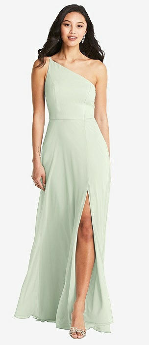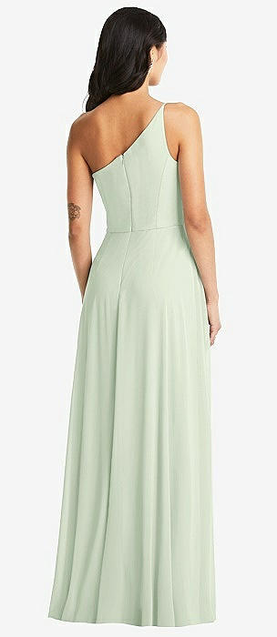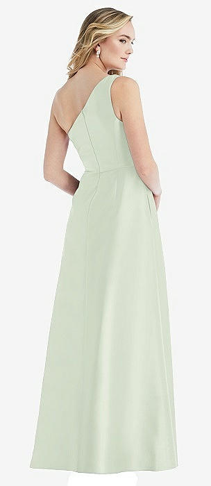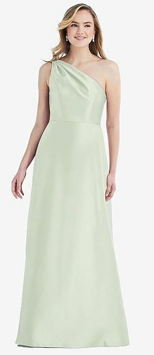 Draped One-Shoulder Satin Trumpet Gown with Front Slit in mint green