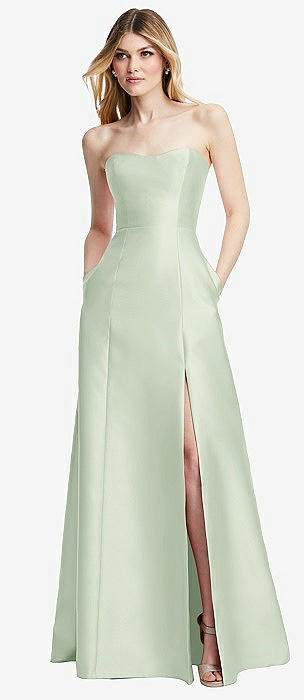 Strapless Satin Gown with Draped Front Slit and Pockets in mint green