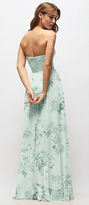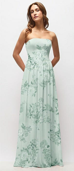 Strapless Basque Drop Waist Floral Chiffon Maxi Dress with Shirred Skirt in mint green floral