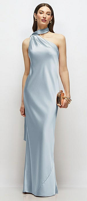 Draped Scarf One-Shoulder Bias Stretch Satin Maxi Dress in mist