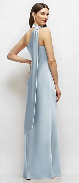 High-Neck Halter Open-Back Satin Trumpet Dress in mist