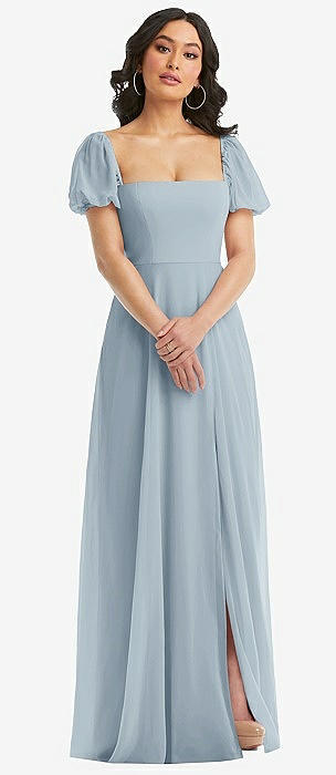 Puff Sleeve Chiffon Maxi Dress with Front Slit in mist
