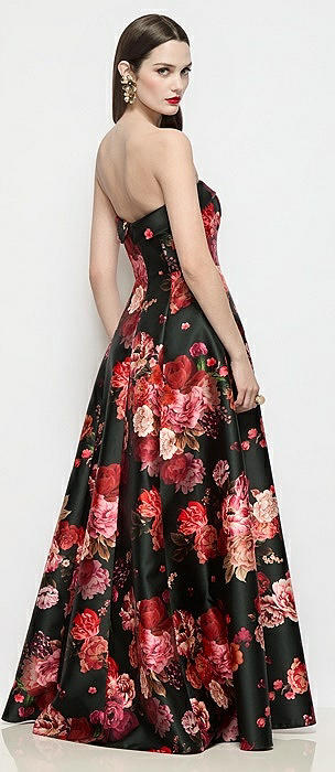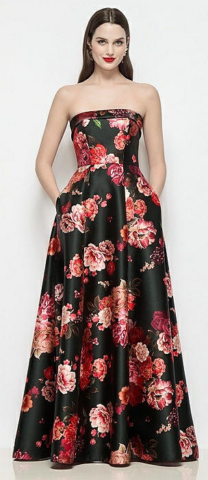 Strapless Bias Cuff Bodice Fleur de Ville Floral Satin Dress in wine black multi
