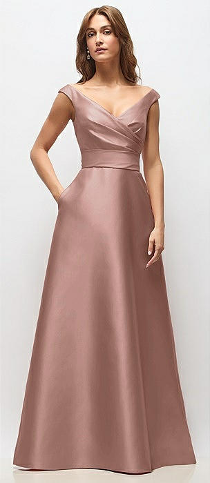 Off-the-Shoulder Draped Wrap Satin Maxi Dress in neu nude