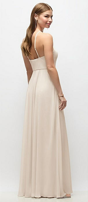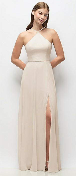 High-Neck Halter Chiffon Maxi Dress with Adjustable Spaghetti Straps in oat