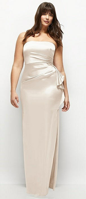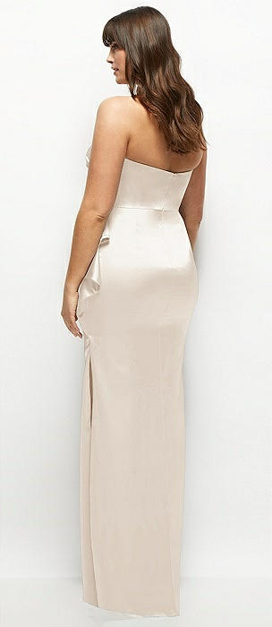 Strapless Draped Skirt Satin Maxi Dress with Cascade Ruffle in oat
