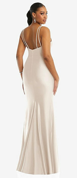 Cowl-Neck Wide Strap Crepe Trumpet Gown with Front Slit in oat