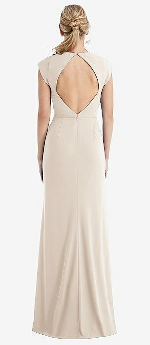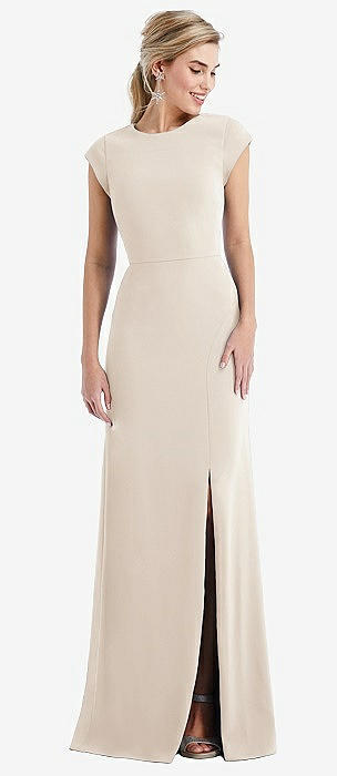 Cap Sleeve Open-Back Trumpet Gown with Front Slit in oat