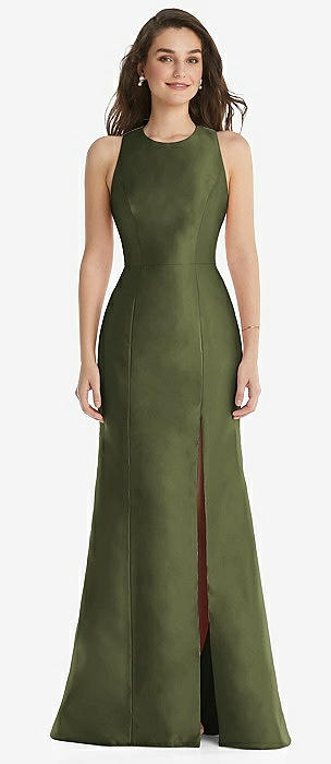 Jewel Neck Bowed Open-Back Trumpet Dress with Front Slit in olive green