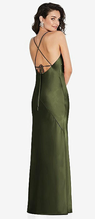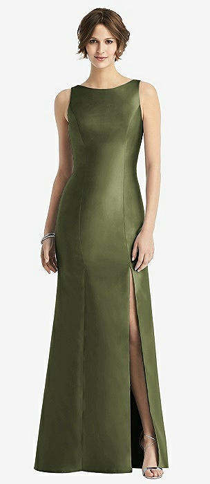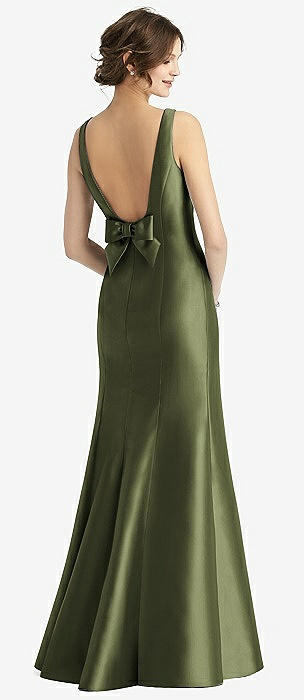 Sleeveless Satin Trumpet Gown with Bow at Open-Back in olive green